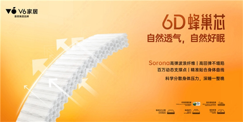 深入研究如何睡的科学不难,但将理论转化为实际产品、打造产品核心竞争力,正是V6家居一直秉持的钻研精神和过硬研发实力。V6家居一直聚焦从睡眠系统到核心材料共同打造健康睡眠体验,6D蜂巢芯产品,是再启支撑科技的新篇章。